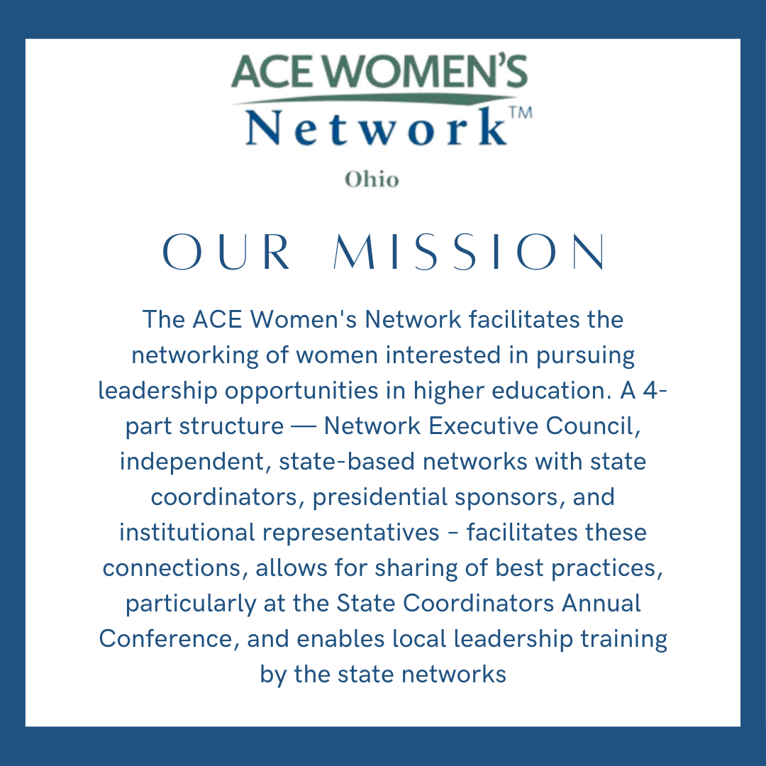 ACE Women’s Network- Ohio works collaboratively with partners across the state to increase the number of women in leadership positions in higher education. The organization hosts an annual conference that is attended by women administrators, faculty, and staff. The event provides opportunities for networking, as well as personal and professional development.